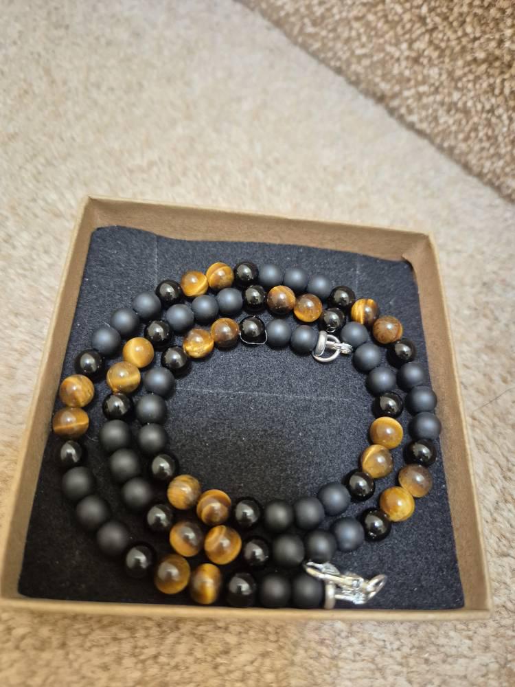 This man’s necklace is quality lovely beads in a nice box to give as a gift really pleased Hubble will love it