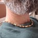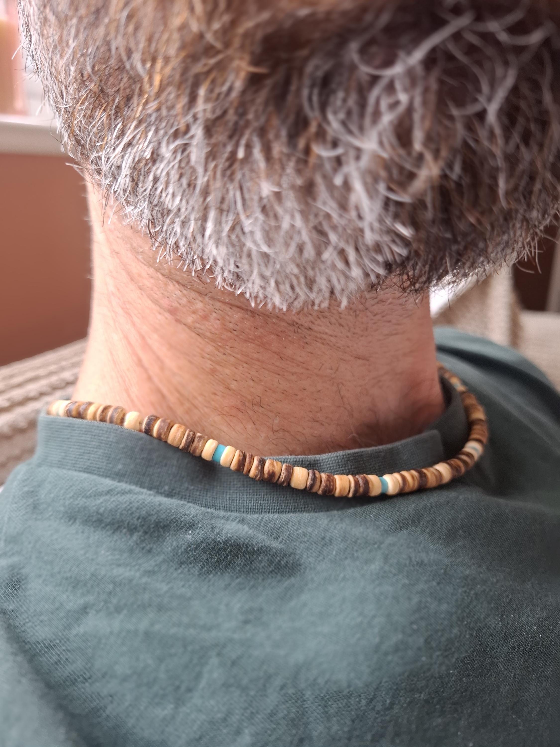 Our rustic men's surfer-style necklace is a simple strand of lightweight, assorted beads fastened with a strong antique-tone brass closure. These highly tactile beads are hand carved from coconut shell and wood, in natural muted shades. No two beads look alike, giving this stylish necklace an organic, natural look and feel. Smoothly polished turquoise creates pops of vibrant colour. It is a lightweight, relaxed-style necklace, perfect for everyday wear.